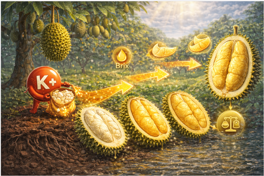Trong cây sầu riêng, Kali đóng vai trò như một “người vận chuyển” cần mẫn. Nó thu gom đường và tinh bột từ bộ lá rồi đẩy hết về trái.