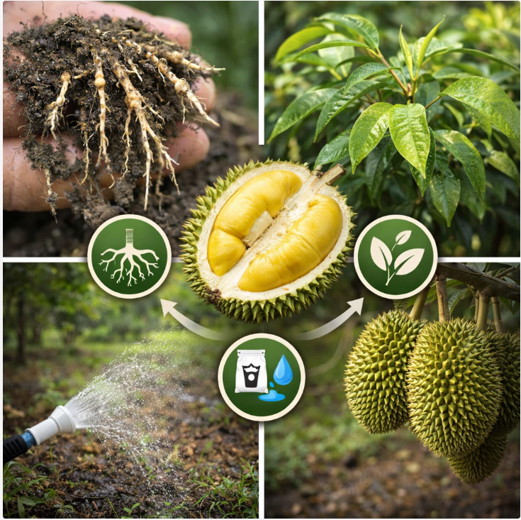 Trong canh tác sầu riêng, vỏ đẹp chỉ là điều kiện cần, chất lượng cơm bên trong mới là điều kiện đủ để bán được giá cao. Để trái đạt tiêu chuẩn: không sượng, không nhạt, lên màu đẹp và độ dẻo ổn định, nhà vườn cần một quy trình phối hợp đồng bộ từ Rễ – Lá – Đọt cho đến Dinh dưỡng và Nước.