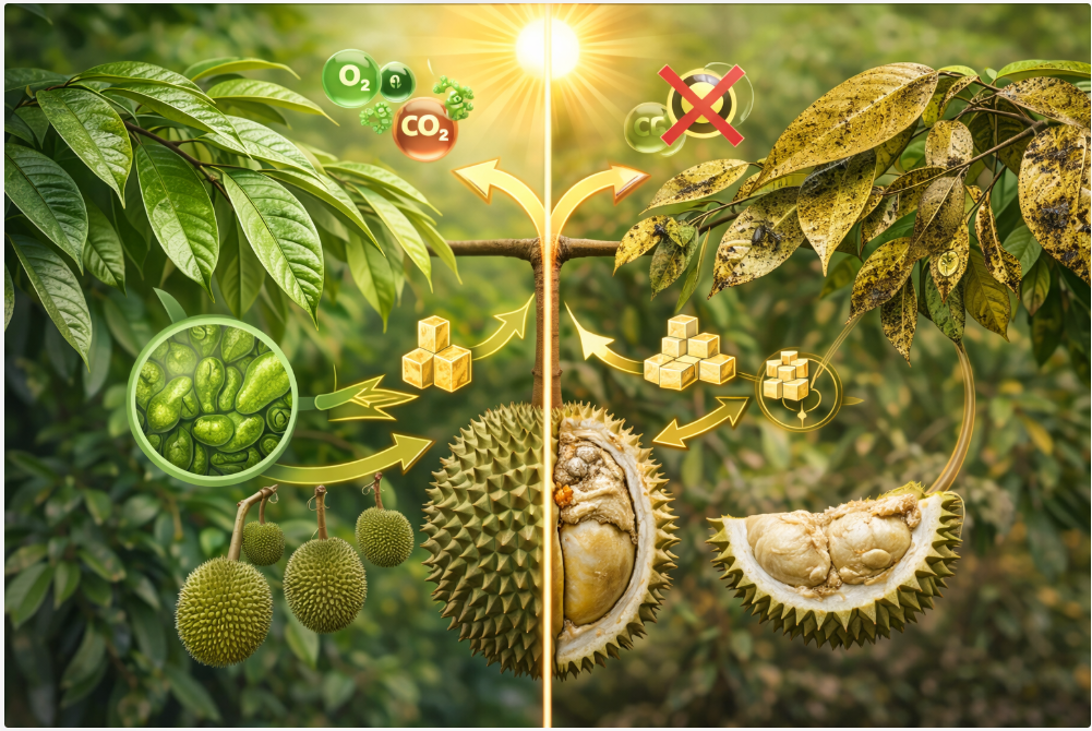 Lá là “nhà máy” tổng hợp đường và tinh bột. Độ dẻo và mùi thơm của sầu riêng phụ thuộc trực tiếp vào khả năng quang hợp của bộ lá.