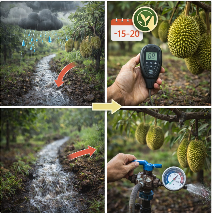 Trước thu hoạch 15–20 ngày: Nên giảm lượng nước tưới từ từ (tùy theo sức cây và thời tiết) để cơm chắc, ngọt và bảo quản được lâu hơn. Mục tiêu là giữ ẩm ổn định, tránh siết nước đột ngột gây sốc cây.