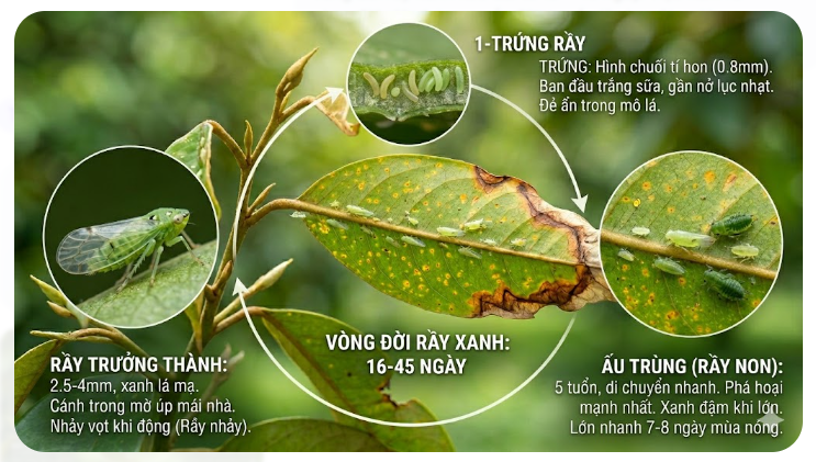 Vòng đời rầy xanh kéo dài từ 16 – 45 ngày. Việc nắm rõ vòng đời giúp bà con cắt đứt nguồn lây lan đúng lúc.