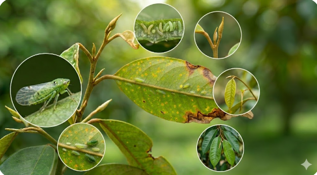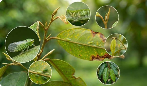 Nhiều bà con thấy cây ra đọt thì mừng, nhưng chỉ vài ngày sau thấy lá non vừa mở đã xuất hiện các chấm vàng, mép lá cháy khô rồi rụng hàng loạt. Đây chính là tác phẩm của rầy xanh (hay còn gọi là rầy nhảy – Allocaridara maleyensis).