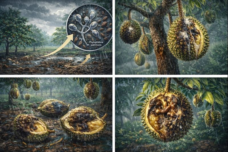 - Tác nhân chính: bệnh thối trái trên sầu riêng chủ yếu do nấm Phytophthora palmivora. Nấm này tấn công nhiều bộ phận của cây và khiến quả nhỏ, chín sớm, thậm chí thối hoàn toàn. Bệnh có thể xuất hiện ở mọi giai đoạn phát triển của quả, kể cả sau thu hoạch