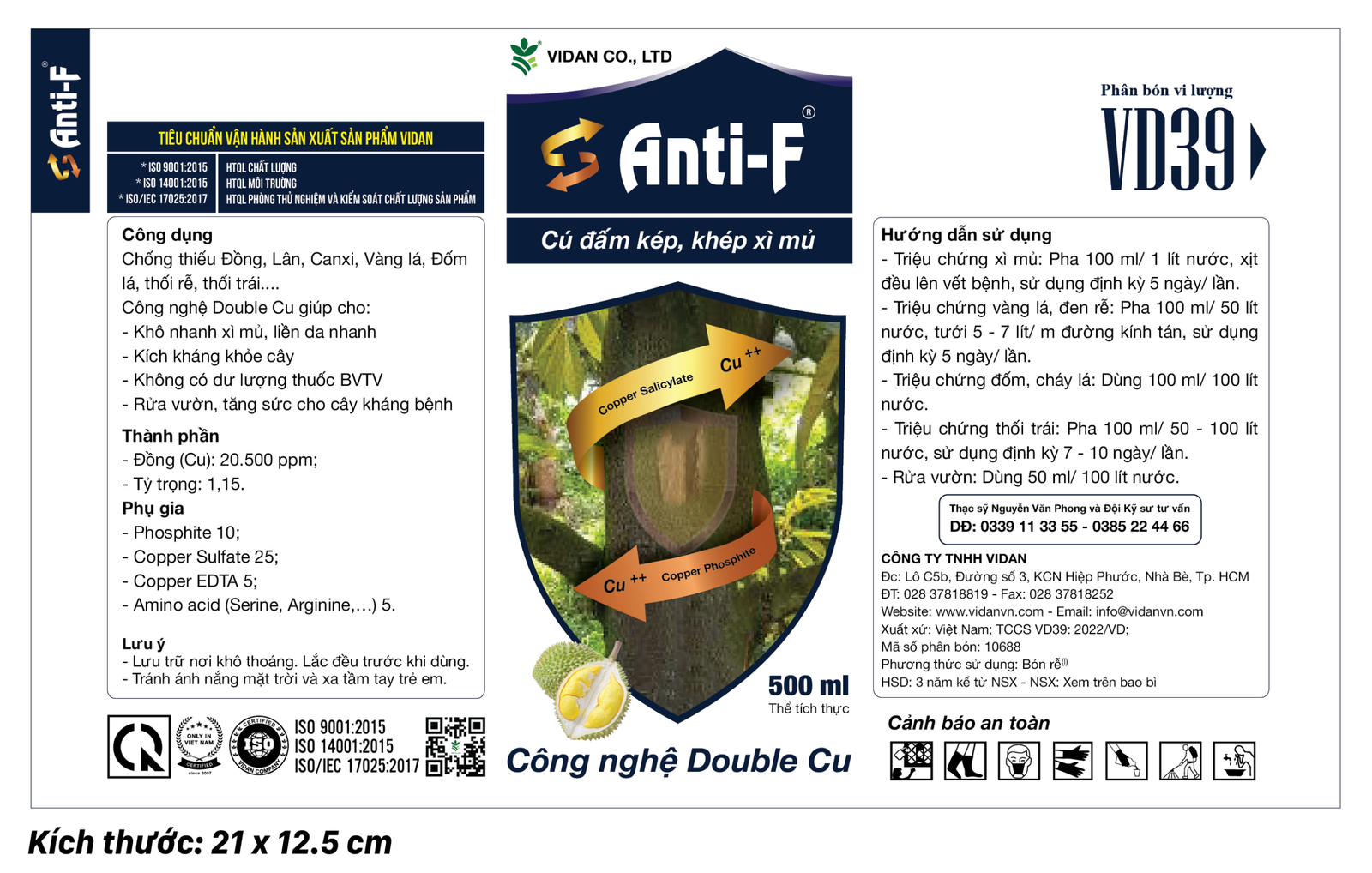Anti‑F là dung dịch bảo vệ cây trồng dựa trên các hợp chất đồng và canxi. Thành phần chính gồm đồng (Cu 20 500 ppm) cùng các phức hợp copper salicylate extra (25 %), copper phosphite extra (10 %), calcium silicate plus (12 %) và tryptophan‑amin plus (5 %). Nhờ vậy sản phẩm giúp bổ sung vi lượng đồng, lân, canxi cho cây, chống hiện tượng vàng lá, đốm lá và thối rễ, làm khô nhanh các vết xì mủ trên thân và liền da nhanh. Ngoài ra, Anti‑F còn có tác dụng kích thích sức đề kháng của cây và rửa sạch vườn, giúp hạn chế nguồn nấm và khuẩn trong mùa mưa.
