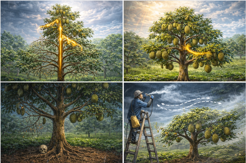 Cành dưới bị “chết mòn”: Khi ngọn quá cao, bóng râm che hết các tầng dưới. Cành thiếu nắng sẽ bị khô, chết dần, làm mất đi những vị trí mang trái đẹp nhất.