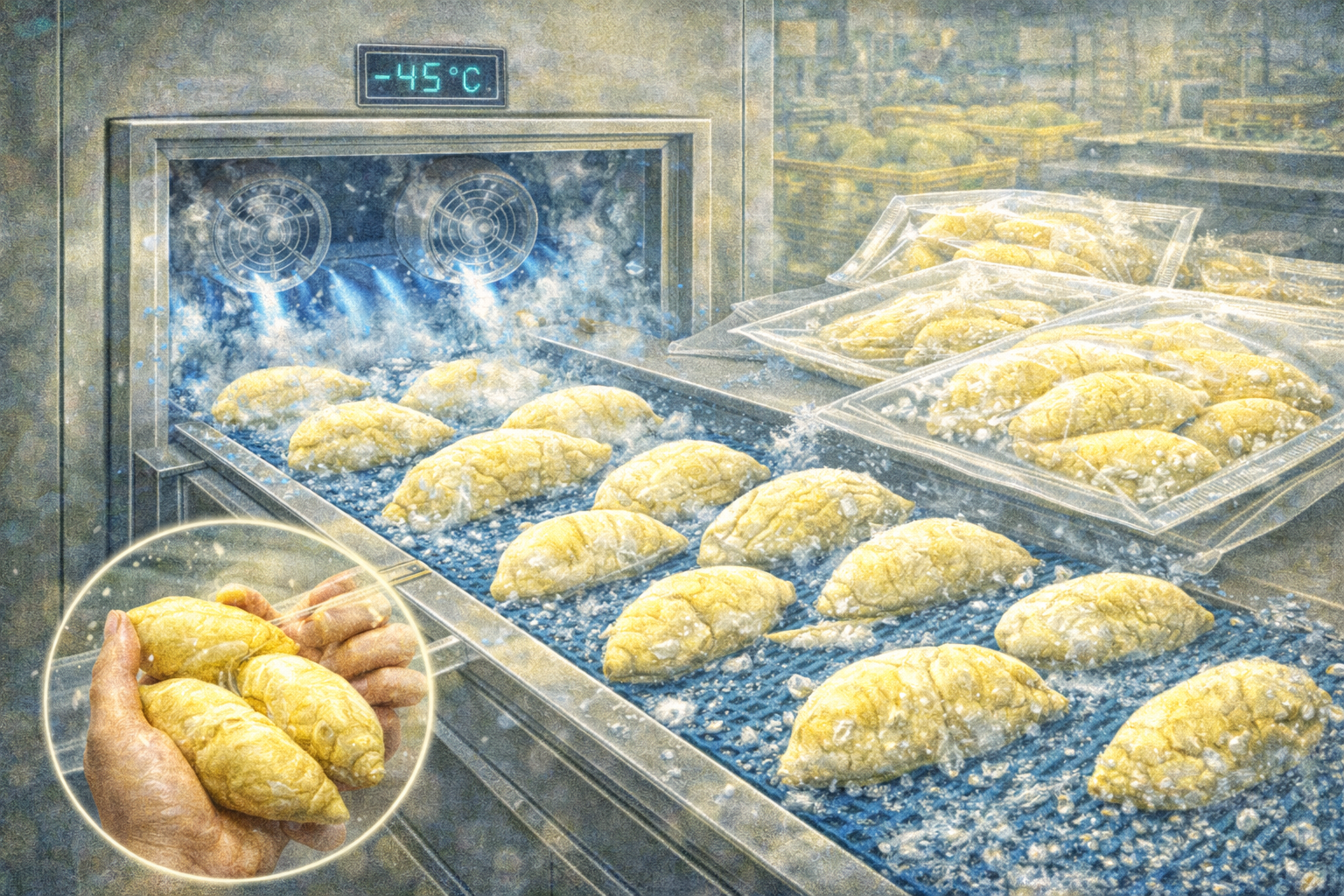 Sau khi tách múi, sản phẩm được đặt trên băng chuyền và đi qua buồng cấp đông ở nhiệt độ từ −35°C đến −45°C. Quá trình làm lạnh diễn ra cực nhanh, tạo ra các tinh thể đá siêu nhỏ. Nhờ vậy, cấu trúc tế bào không bị phá vỡ.