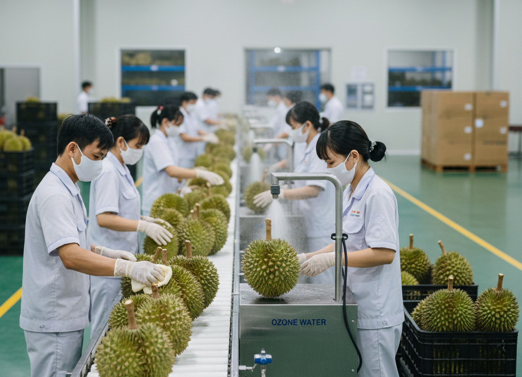 Ngay sau khi thu hoạch, sầu riêng được đưa vào khâu phân loại và sơ chế. Tại đây, công nhân tiến hành làm sạch bề mặt quả bằng khăn mềm hoặc xử lý bằng nước Ozon – một phương pháp khử khuẩn nhẹ nhàng nhưng hiệu quả. Bước này giúp loại bỏ bụi bẩn, hạn chế vi sinh vật gây hại và đảm bảo trái đạt tiêu chuẩn trước khi đưa vào bảo quản.