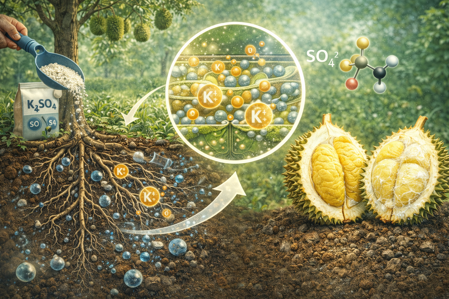Khi bón kali sunphat với liều lượng hợp lý vào giai đoạn trái đã phát triển gần hoàn chỉnh, ion K⁺ góp phần ổn định cấu trúc tế bào và hỗ trợ quá trình khử nước thừa trong quả. Nhờ đó, cơm sầu riêng giữ được độ ráo, hạn chế nhão thịt và giảm nguy cơ sượng. Điểm quan trọng là gốc sunphat (SO₄²⁻) trong K₂SO₄ không gây tích mặn như gốc clo trong KCl, nên an toàn hơn cho hệ rễ, đặc biệt trong điều kiện đất ẩm liên tục.