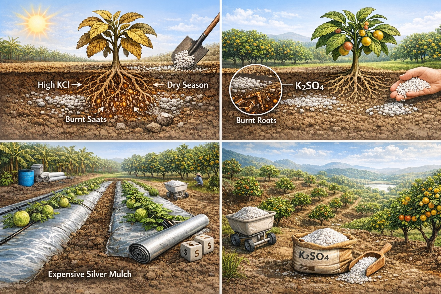 Giải pháp phủ bạc được một số vườn áp dụng để hạn chế nước thấm vào vùng rễ, nhưng phương pháp này đòi hỏi chi phí cao và chỉ phù hợp với những vườn có hệ thống mương rãnh hoàn chỉnh. Trong khi đó, dằn kali sunphat linh hoạt hơn, có thể áp dụng cho cả vườn đồi, đất dốc hoặc đất thịt nặng.