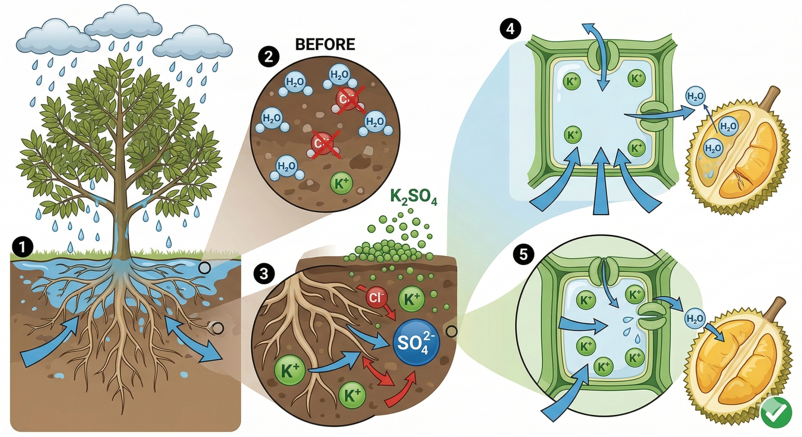Khi bón kali sulfat với liều lượng hợp lý vào giai đoạn trái đã phát triển gần hoàn chỉnh, ion K⁺ góp phần ổn định cấu trúc tế bào và hỗ trợ quá trình khử nước thừa trong quả. Nhờ đó, cơm sầu riêng giữ được độ ráo, hạn chế nhão thịt và giảm nguy cơ sượng. Điểm quan trọng là gốc sulfat (SO₄²⁻) trong K₂SO₄ không gây tích mặn như gốc clo trong KCl, nên an toàn hơn cho hệ rễ, đặc biệt trong điều kiện đất ẩm liên tục.