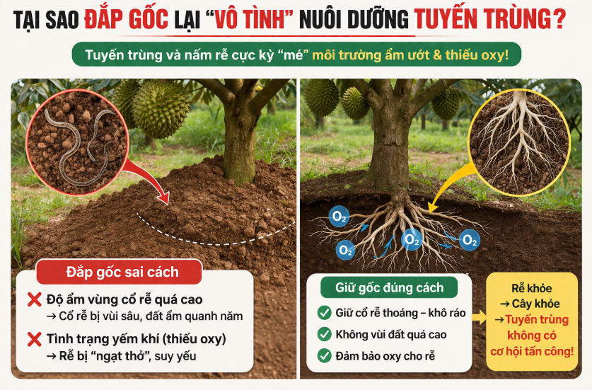 Tuyến trùng và nấm rễ (như Phytophthora, Fusarium) rất sợ khô hạn nhưng lại cực kỳ “mê” môi trường ẩm ướt và thiếu oxy. Khi bà con bồi đất lên gốc, nếu không cẩn thận sẽ tạo ra hai tác động xấu: