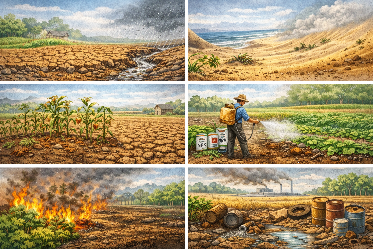 - Rửa trôi và xói mòn: Mưa lớn ở vùng đồi dốc cuốn trôi lớp đất mặt, làm mất mùn và chất dinh dưỡng. Hạn hán kéo dài hoặc gió mạnh cũng có thể làm đất cát ven biển bị thổi bay và trở nên nghèo dinh dưỡng.