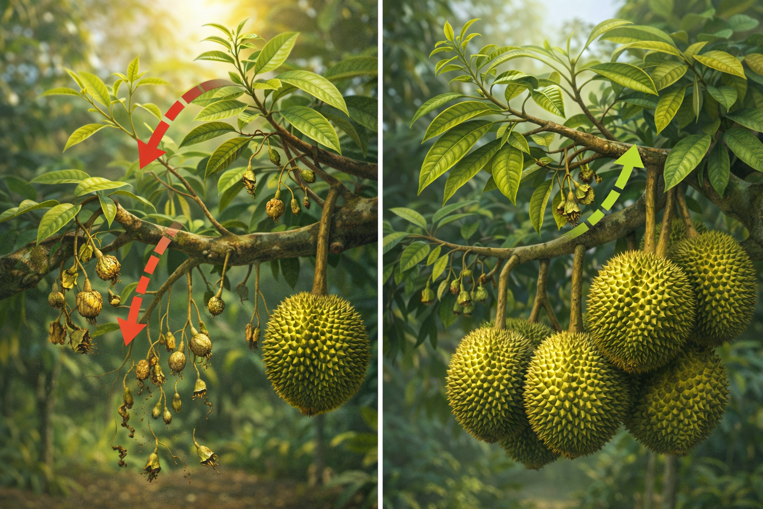 Vào đầu mùa mưa, thời tiết ẩm, nhiệt độ giảm, đất ướt và lượng đạm dễ tiêu trong đất thường tăng. Đây là điều kiện “kích lộc” khiến sầu riêng bung đọt sớm dù trái còn non. Nếu không kiểm soát, hậu quả thường gặp là: