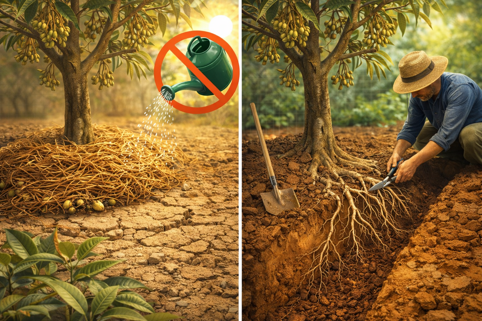 – Cắt tỉa rễ và đào rãnh: Giải pháp này hạn chế sự phát triển của chồi, cho phép cây sầu riêng tập trung vào việc ra hoa và hình thành nụ.
