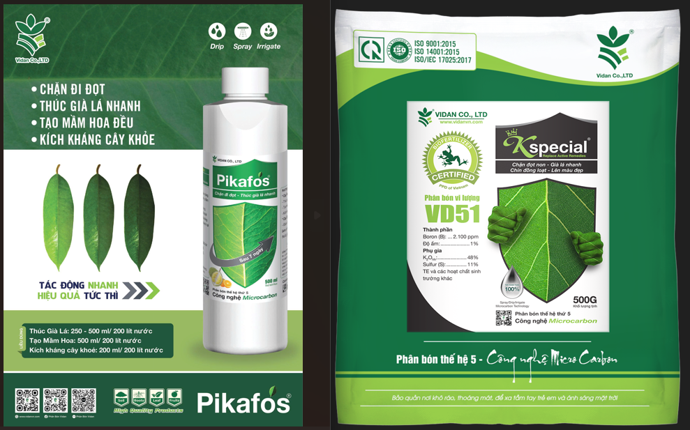 👉 Kspecial: Chứa kali và trung vi lượng, Kspecial giúp tăng cường quá trình già lá, chặn đọt nhưng vẫn giữ cho lá xanh tươi và khỏe mạnh, giảm rụng lá và duy trì độ bền của tán lá trong suốt mùa vụ.
