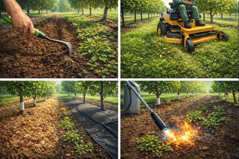 - Xới đất và làm cỏ tay: Đây là cách truyền thống để loại bỏ cỏ lâu năm và giúp đất thoáng khí. Ở các vườn cây ăn quả hữu cơ tại bang Washington (Mỹ), việc cày xới mỗi 3 tuần là hiệu quả nhất để diệt cỏ non. Tuy nhiên, người làm cần cẩn thận để không làm hỏng rễ cạn hoặc hệ thống tưới.