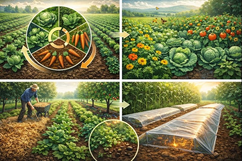 - Luân canh cây trồng: Thay đổi loại cây theo mùa giúp phá vỡ vòng đời cỏ dại và sâu bệnh. Tài liệu của NC State Extension khuyên rằng luân canh, trồng xen cây phủ, chuẩn bị luống sạch và xử lý đất bằng năng lượng mặt trời (Solarization) đều giúp ngăn hạt cỏ nảy mầm và hạn chế cỏ lây lan.