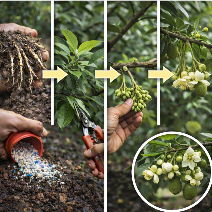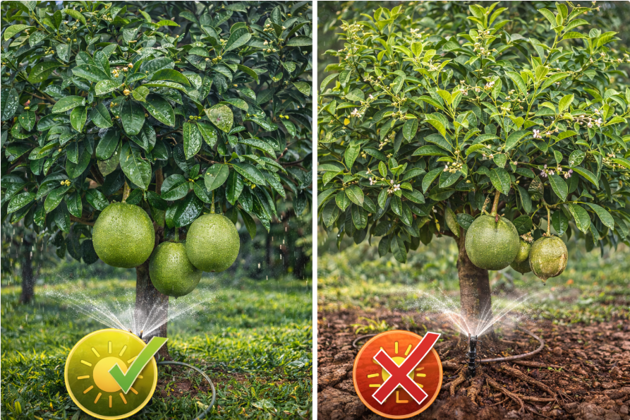 Trong mùa mưa, làm hoa bưởi da xanh khó nhất không phải là “Kích cho ra hoa”, mà là giữ được hoa – giữ được trái non. Nguyên nhân sâu xa thường là cây bung chồi mạnh cùng lúc với ra hoa, khiến dinh dưỡng ưu tiên nuôi lá non, còn quả non bị “thiếu phần” và rụng hàng loạt. Vì vậy, quy trình hiệu quả cần đi theo hướng: Làm già lá sớm – khống chế rễ – kìm chồi – rồi mới thúc hoa.