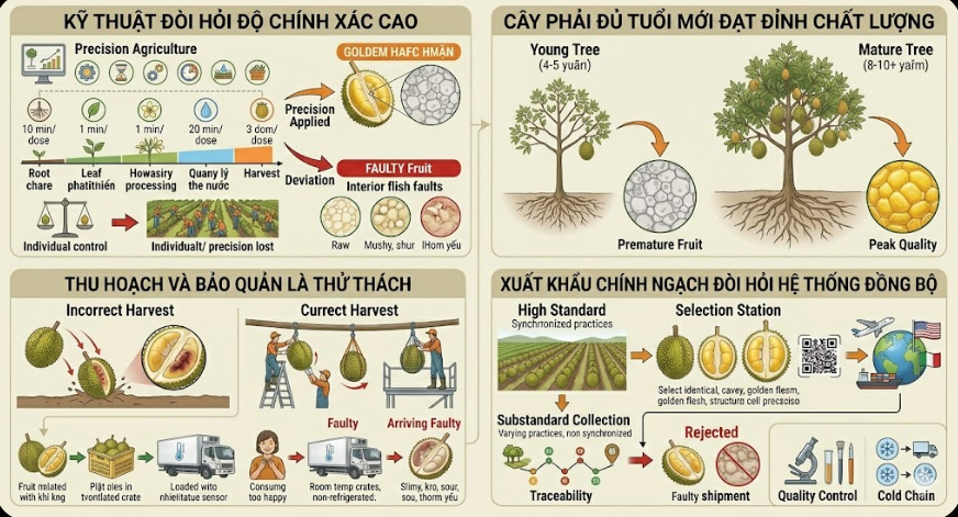 Tuy nhiên, nhiều nhà vườn vì áp lực tài chính đã khai thác từ năm thứ 4–5. Trái có thể đẹp hình thức nhưng: