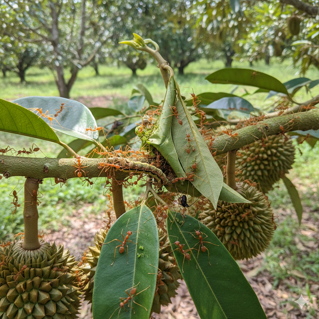 Đặc biệt trong vườn sầu riêng, xoài, nhãn, kiến vàng có thể đóng vai trò như một “hệ thống bảo vệ 24/7” tự nhiên và hiệu quả.