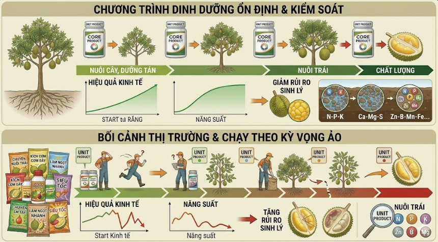 Thực tế, ở mọi giai đoạn sinh trưởng như nuôi cây, dưỡng tán, nuôi trái, tăng độ dày cơm và cải thiện chất lượng, cây ăn trái chủ yếu cần các nhóm dinh dưỡng nền tảng: Đa lượng (Đạm, Lân, Kali), Trung lượng (Canxi, Magie, Lưu huỳnh) và Vi lượng (Kẽm, Bo, Mangan, Sắt, Đồng, Molypden… và các nguyên tố khác). Nhiều sản phẩm trên thị trường được gắn nhãn “chuyên nuôi trái”, “kích cơm dày”, “làm ngọt nhanh”… nhưng cốt lõi vẫn xoay quanh các nguyên tố cơ bản này. Vì vậy, thay vì chạy theo những kỳ vọng quá “ảo” và biến mùa vụ của mình thành nơi thử nghiệm, hãy chủ động chọn các sản phẩm “chủ lực” từ doanh nghiệp uy tín, trải nghiệm xuyên suốt từ giai đoạn chăm cây để hiểu rõ, rồi áp dụng tự tin và tự chủ vào giai đoạn chăm trái của bạn.