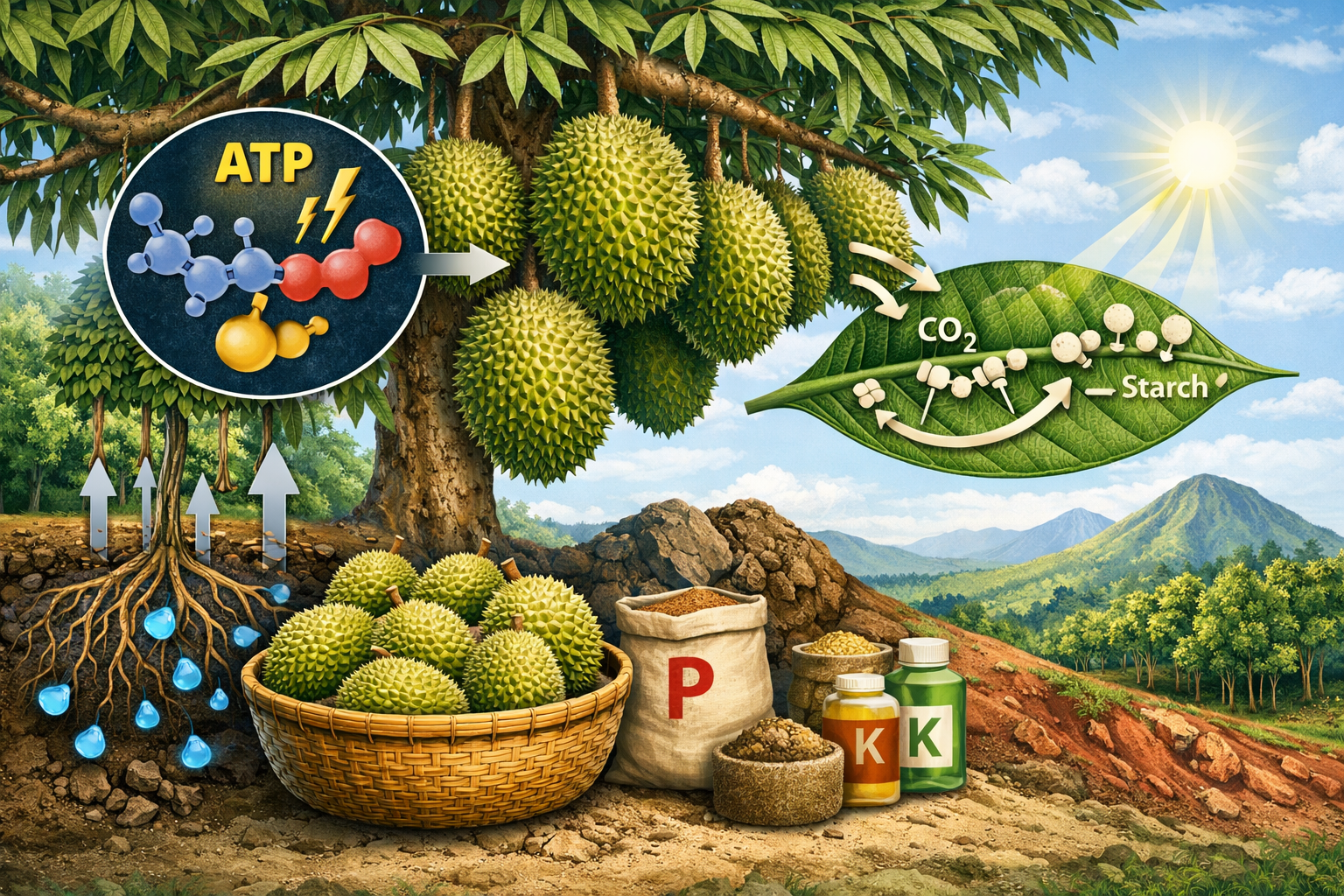 • Thúc đẩy quang hợp: ATP giúp rễ hút nước mạnh hơn, lá hấp thụ $CO_2$ tốt hơn, từ đó kích hoạt quá trình quang hợp dưới ánh nắng mặt trời để tạo ra đường (Glucose) và tinh bột cho cơm trái.