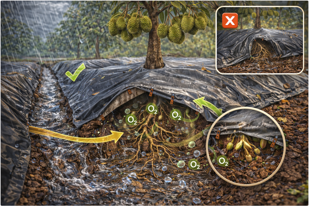 Kết quả là dù phủ bạt “rất kỹ”, trái vẫn sượng, thối cơm, tăng bệnh rễ, thậm chí trái phát triển lệch.