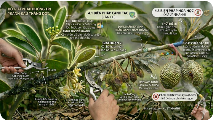 Kéo đọt đồng loạt: Đây là mẹo cực hay. Bà con bón phân, tưới nước sao cho cả vườn ra đọt cùng lúc. Khi đó, mình chỉ cần phun xịt tập trung 1-2 lần là sạch rầy, tránh tình trạng “cây này ra, cây kia nghỉ” làm rầy cứ bay qua bay lại trú ngụ.
