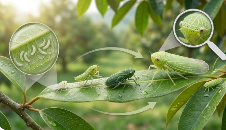 Trưởng thành (2 – 21 ngày): Thân dài khoảng 2,5 – 4 mm, màu xanh lá mạ. Cánh trong mờ xếp úp như mái nhà. Đặc biệt đầu có vân trắng và chấm đen nhỏ – đây là “chứng minh nhân dân” của rầy xanh sầu riêng.