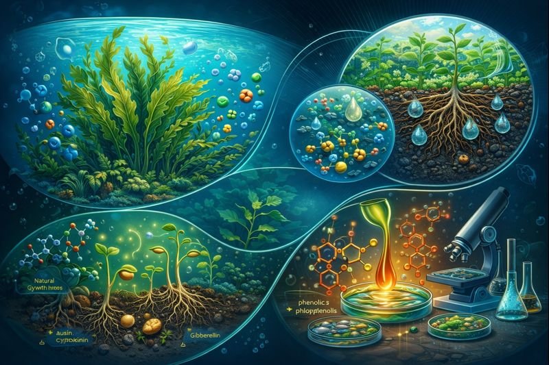 • Chất chống oxy hóa và polyphenol: Chiết xuất rong biển rất giàu polyphenol và chất chống oxy hóa tự nhiên. Các nhà khoa học thấy rong biển, đặc biệt là tảo nâu, chứa nhiều phenol và phlorotannin. Những hợp chất này giúp tăng cường khả năng chống ô‑xi hóa và bảo vệ cây khỏi stress.