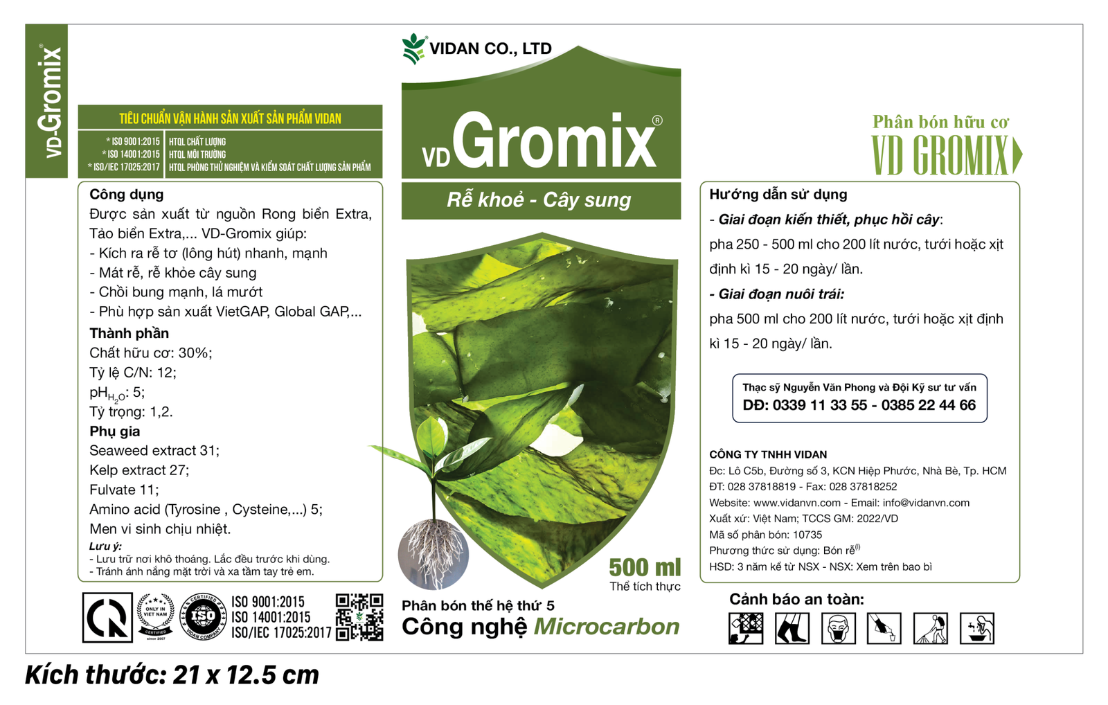Sản phẩm VD‑Gromix 500mL của công ty VIDAN. Theo thông tin sản phẩm, VD‑Gromix được sản xuất từ rong biển Extra và tảo biển Extra, có thành phần hữu cơ 30 % m/v. Thành phần chi tiết bao gồm chiết xuất rong biển 31 %, chiết xuất tảo biển 27 %, oligo‑fulvate 11 %, tryptophan‑amin 85 % (5 %)men vi sinh chịu nhiệt. Chính nhờ nguồn gốc rong biển này, sản phẩm cung cấp nhiều dưỡng chất hữu cơ và vi lượng.