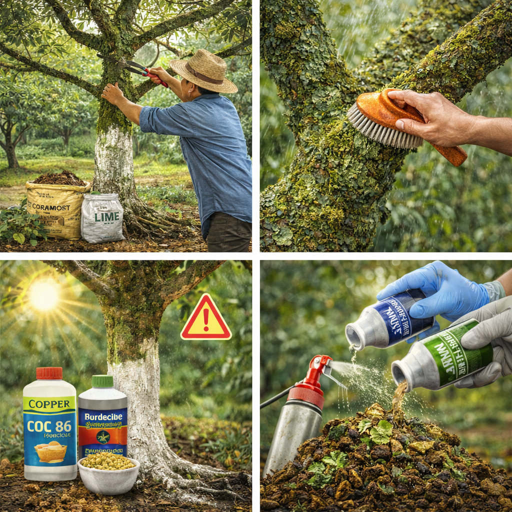 - Cơ học: Cạo sạch lớp rong rêu trên vỏ cây.