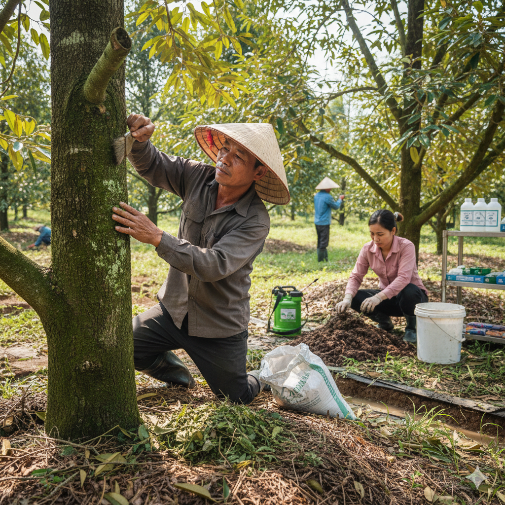 - Quét vôi ở gốc để ngăn ngừa nấm đất và tăng pH vùng rễ.