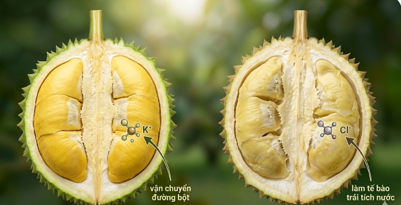Clo (Cl⁻): Đây chính là “nhân vật phản diện”. Sầu riêng là loại cây cực kỳ nhạy cảm với Clo. Khi cây ăn quá nhiều Clo, nó sẽ làm tế bào trái tích nước.