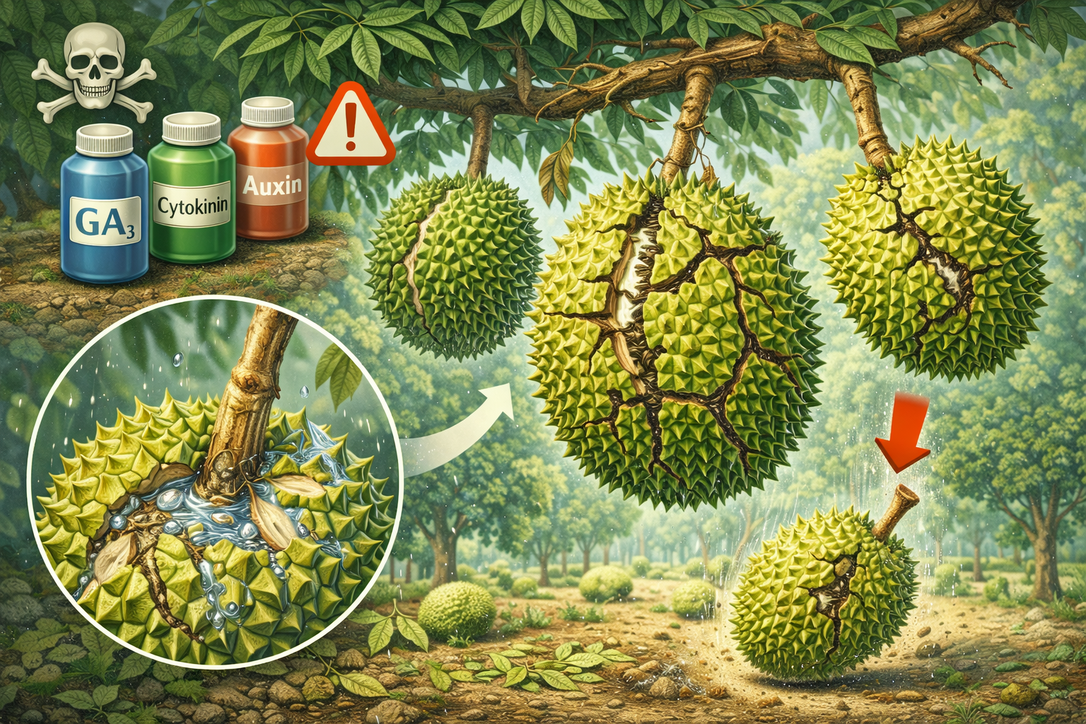 Các hoạt chất như GA₃ (Gibberellic Acid), Cytokinin, Auxin hay Brassinosteroid thường được dùng để kích trái lớn nhanh. Tuy nhiên, nếu dùng ở giai đoạn sau 90 ngày, hậu quả sẽ cực kỳ nghiêm trọng: