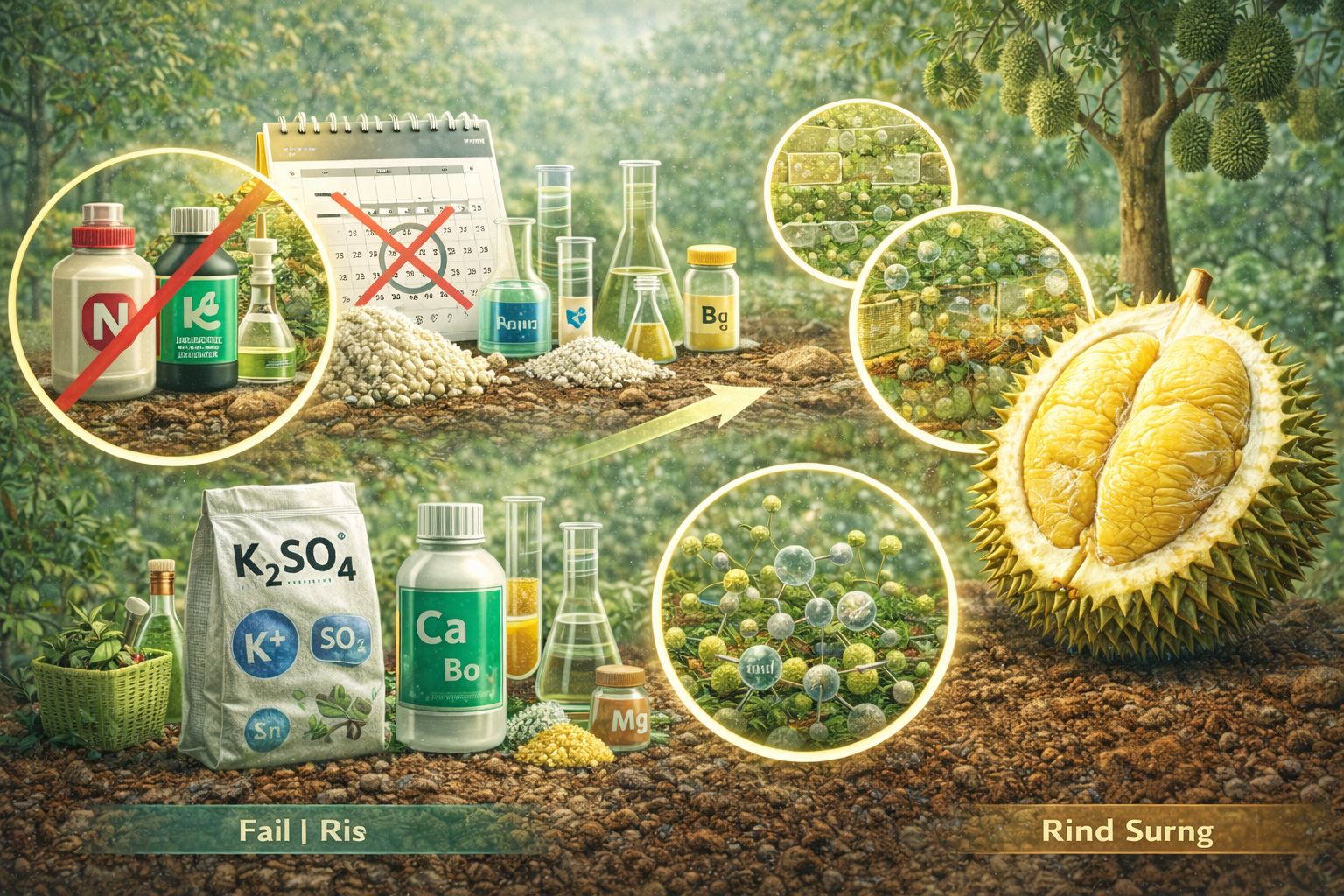Kali Sulphate ($K_2SO_4$): Giúp vận chuyển đường về trái, làm cơm vàng và ráo. Tránh dùng Kali Clorua (Kali đỏ) vì Clo có thể làm sượng trái.